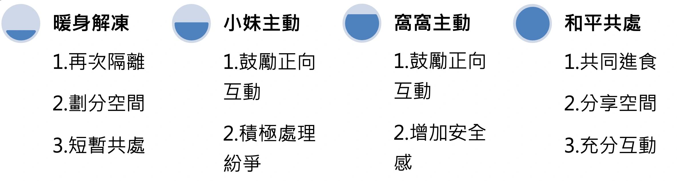 瑋真醫師建議我先暫停這種虛掩木門的互動方式,於是,我們還是回到輪流放風的制度。不過,由於輪流放風的時候,隔開他們的其實是能看見彼此、觸碰到彼此的柵欄。於是開始另一個策略:當他們隔著門主動靠近彼此,並且是呈現放鬆的肢體表現時,分別提供點心,讓他們在心情放鬆的相處時得到 bonus!這個策略後來慢慢奏效了,也才讓他們進入了第三階段。